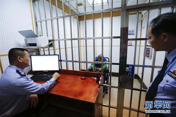 4月24日,跨国网络赌博案犯罪团伙头目黄某(中)在广东省珠海市第二看守所接受审讯。