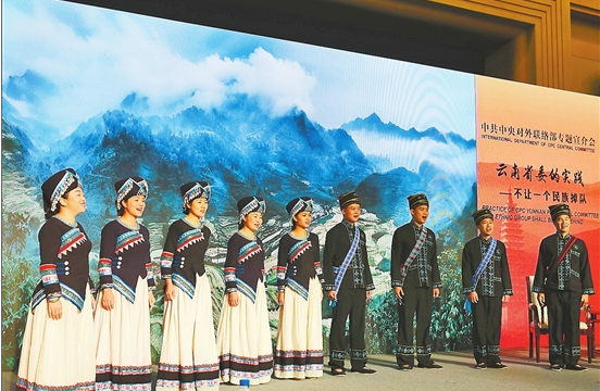 27日,中共中央对外联络部里近400名外国政党政要、驻华高级外交官及国际组织驻华代表专注聆听着来自云南的扶贫故事。宣介会尾声,穿着壮族传统服饰的歌者缓步走上台一字排开,没有任何乐器伴奏,10位团员用声线演绎出8个不同声部,一首《今天好日子》宛若天籁之音。