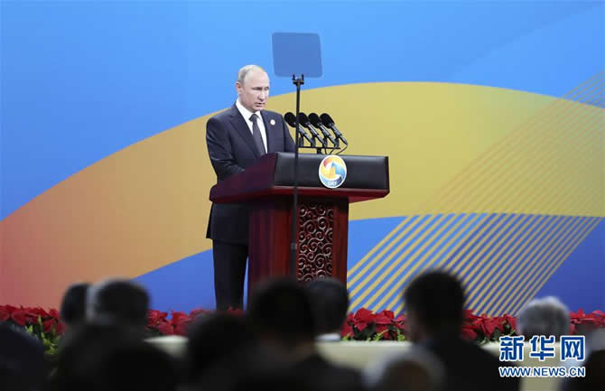 5月14日,“一带一路”国际合作高峰论坛开幕式在北京国家会议中心举行。这是俄罗斯总统普京在开幕式上致辞。 新华社记者 庞兴雷 摄