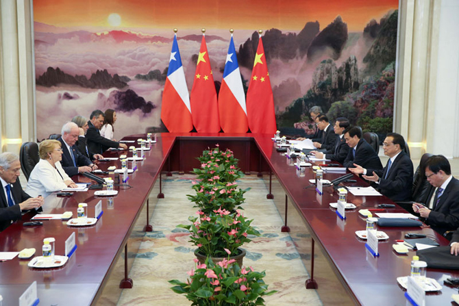 国务院总理李克强5月14日下午在人民大会堂会见来华进行国事访问并出席“一带一路”国际合作高峰论坛的智利总统巴切莱特。