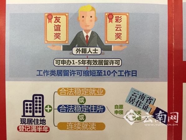 4、在我省获得“友谊奖”、“彩云奖”的外籍人士,可按需申请办理1-5年有效居留许可。外籍人员办理工作类居留许可,符合申请条件的,办理时限由15个工作日缩短至10个工作日。