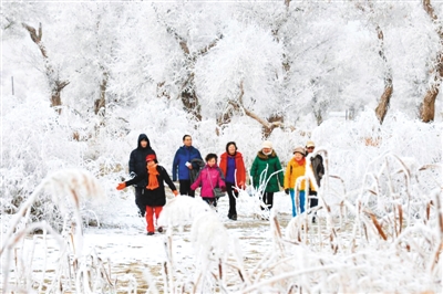 图为新疆塔里木河尉犁县段的胡杨雾凇景观。