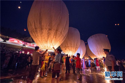 4月13日,人们在活动现场放飞孔明灯。当日,各族群众和国内外游客在云南西双版纳景洪市澜沧江畔放飞孔明灯,欢庆傣历1379年新年。 新华社记者 胡超 摄