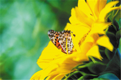 金色向日葵引来蝴蝶。昆明日报 林受里 摄