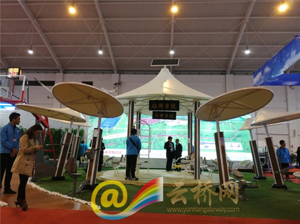 除了这个时尚的器材,云健体育还带来了可以称体重的跑步机、小巧的动感单车。最吸引人的还是这个展区的环保式设计,一进展区,感觉走到一个公园。沐春说,云健体育专门为这次展会布置了“健身步道”,环保、健康是这个产品最重要的特点。“健身步道”只是“全人群智能体育公园”的一个点。“全人群智能体育公园基于全民健身的科学理念,采用体育与周围景观的有机融合,将服务对象定位在全体健身人群。我们可以看到,通过二维码扫描、客流眼监测及移动互联网终端的分析处理,可随时了解器材使用介绍,网络报修及健身人群各项身体指标,真正实现"体育+旅游+互联网+运动健身云专家"的核心内涵,实现科学健身的目的。”沐春说。