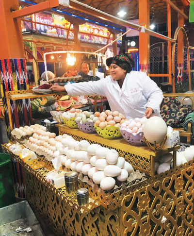“烤蛋!烤蛋!”循声望去,不远处的摊位前摆满了鸡蛋、鹅蛋、鸽子蛋,大小不一,最大个的要数鸵鸟蛋。摊主海里且木罕卖力地吆喝着,引来了不少食客。从老夜市到去年新开张的这个新夜市,她一直经营着烤蛋。只见她熟练地将鹅蛋顶部开洞,倒出蛋清,加入鸡蛋、鸽子蛋的蛋黄,再舀上一勺蜂蜜、藏红花,放到炭灰中稍加烤制,便做成了卖得最好的“烤三蛋”。“每天能挣五六百块!”她说,不少外地游客专门来她家吃烤蛋。