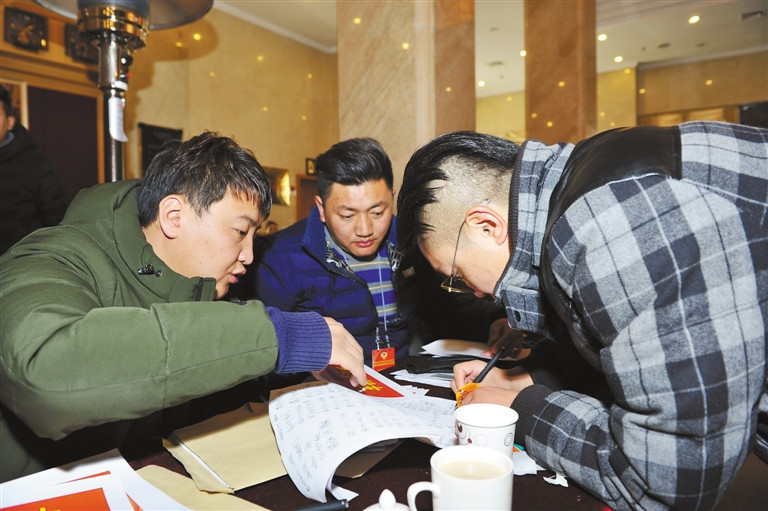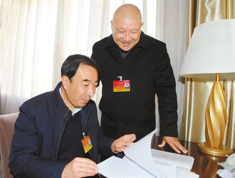 来自山南市的人大代表黄金刚(左一)和尼玛扎西(右一)在驻地准备会议材料。 记者 次旺 旦增 摄