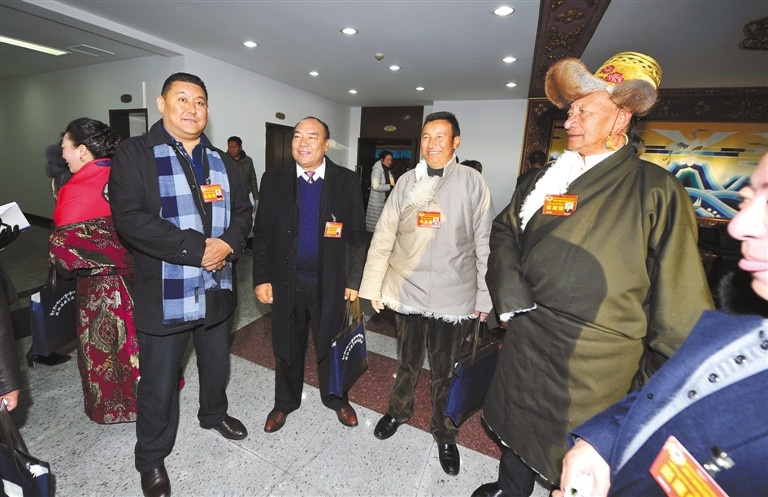 参加自治区政协十届五次会议的委员们在会议前夕相互交谈。 记者 旦增西旦 摄