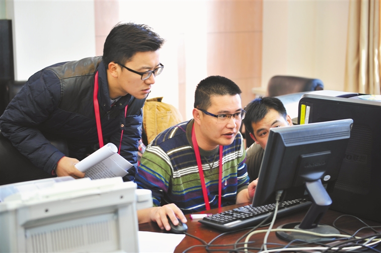 记者们正在新闻媒体中心实时传送两会稿件。 记者 丹增群培 摄