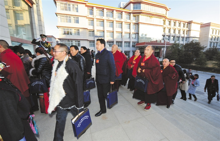 参加自治区政协十届五次会议的委员们步入会场。 记者 旦增西旦 摄