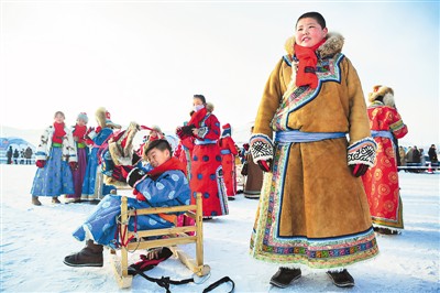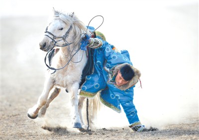 近日,内蒙古自治区第十四届冰雪那达慕在西乌珠穆沁旗举办,当地蒙古族群众身着民族盛装,进行赛马、套马、蒙古马选美等蒙古族传统体育活动。