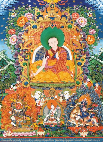 二是构图丰富。按照藏传佛教的宗教仪轨,唐卡通常来说应该严格对称。当代唐卡作品出现了构图的不完全对称,有侧面的佛像,动态也更加活泼。甚至不同的画师,笔下佛像的表情会有微妙的不同。可见,唐卡画师的个性无意识地流露在作品中。这种表现,虽然是微妙而不易觉察的,却透露出当下时代对个性的追求,也就是对现代性的追求。