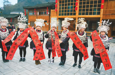 1月16日,贵州省剑河县文联和书法协会的志愿服务队走进苗寨,开展“春联送祝福入苗乡”公益活动。图为观么镇村民展示春联。