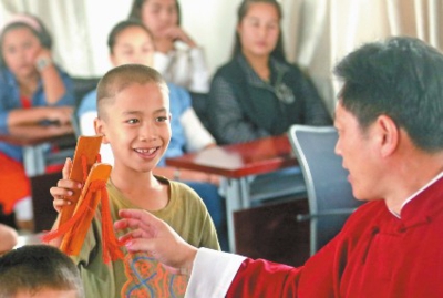 2016年9月4日,8岁的阿不都热合曼·买和木提在相声演员魏国栋的指导下练习打快板。(资料图片)