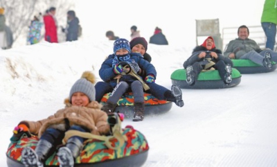 “记忆里上回一群人玩雪,是十几年前的事了,小时候都是滑爬犁,这还是我第一次来滑雪场玩……”阿依夏木·卡迪尔带着7岁的儿子坐在雪圈里和结亲的干部们一起玩耍。