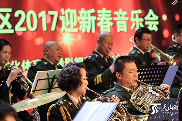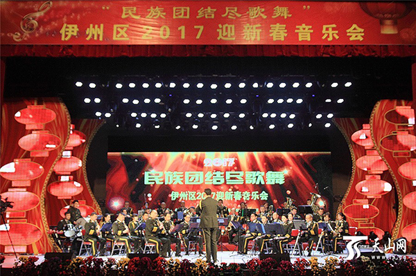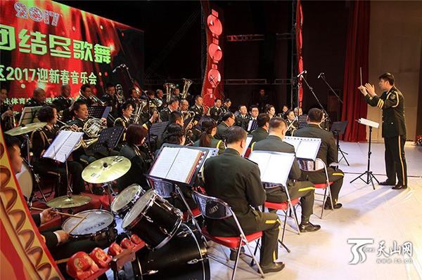 天山网讯(记者曹新加摄影报道)1月21日,由新疆哈密市伊州区文体广新局主办,伊州区文化馆、伊州区战友管乐团承办的“民族团结尽歌舞”2017迎新春音乐会在南粤文化中心举行。