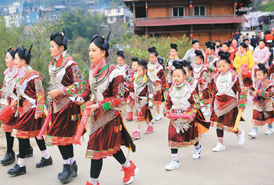 2月1日,广西柳州市融水苗族自治县安陲乡大伞村、白云乡九俄村、驻融水红瑶芦笙队,开展瑶族传统的“打同年”活动,主客双方进行了进寨、围同年、芦笙踩堂等民族传统活动,喜庆新春佳节。“打同年”是当地少数民族村寨之间开展的联谊活动,意为交朋友,一般在新春期间进行,参加活动的村民互称“同年”。图为安陲乡大伞村瑶族姑娘身着节日盛装参加“打同年”活动。