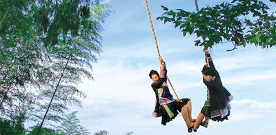 树不仅是祭祀的对象,也是欢乐的源头。把用草编的绳子系在高高的树杈上,就成了简易的秋千。在岜沙,青年男女从小就会荡秋千,荡秋千也是寻找意中人的方式。当姑娘们把秋千荡得老高,同时向下面的小伙子们频送秋波,如果哪个男生被打动,就会跳上秋千一起荡,荡得越高说明两人越情投意合。