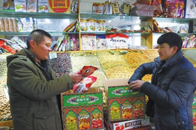 1月22日,在乌鲁木齐市东环干果市场,商户杨士东帮麦麦提图尔贡·阿吉木装干果。三年多的相处,让他们两人像亲兄弟一般。