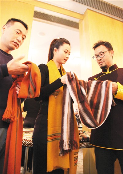 日前,在北京举办的西藏传统工艺传承与发展综合项目介绍会上,国家级非遗项目珞巴族纺织品引人注目。2010年,文化部非遗司结合“生产性保护项目”,组织由设计师、专家组成的团队,进藏开展传统工艺传承与发展综合项目,对珞巴纺织、金东藏纸等民族地区文化项目进行了传承、挖掘,在林芝和山南等地的乡村进行了田野调查,建立西藏色彩库。同时还通过把当地传统手工艺品推向市场,解决民族地区就业,增加藏民收入。图为洛桑成来(右)介绍珞巴族纺织品的用料及工艺。