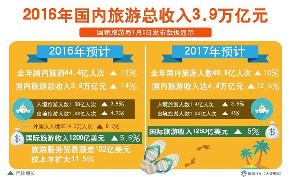 不知不觉间,我国已经迈入全民旅游的新时代。根据国家旅游局的统计,2016年国内旅游人数44.4亿人次,国内旅游总收入为3.9万亿元。旅游业上升为服务经济的支柱行业和国民经济的重要行业,旅游带动其他产业发展的“旅游+”格局已经形成。新旅游时代需要新的管理模式和发展思维。规范旅游市场、提升服务水平,把国内旅游资源经营好亟需相关部门有所作为。
