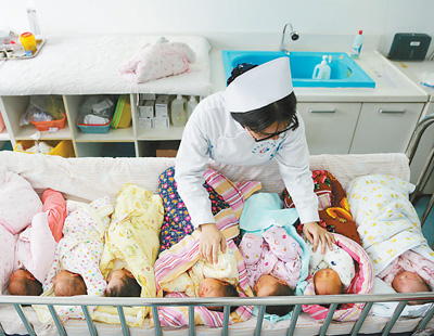 全面放开二孩政策以来,很多高龄妇女加入了生二孩的队伍,各地医院产科迎来婴儿出生潮。图为春节前夕,湖北襄阳第一人民医院产科护士在护理新生儿。 陈 文摄