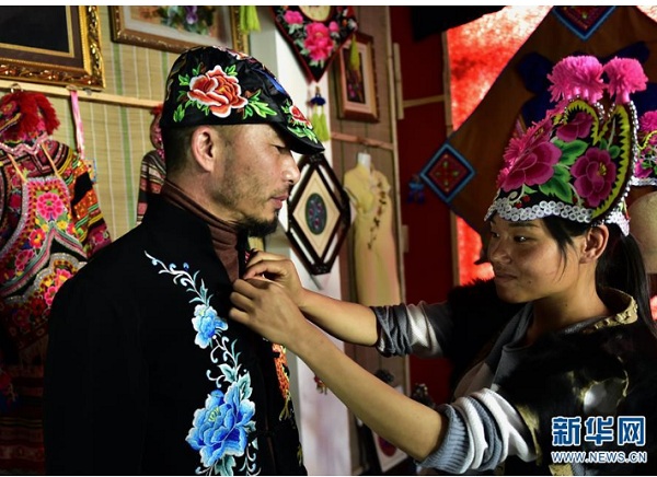 3月29日,彝族绣女李晓丽(右)为顾客试穿彝绣服装。
