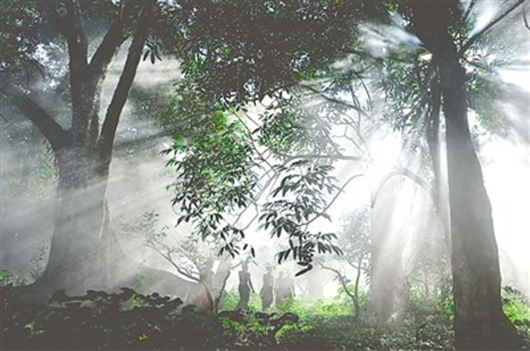 古木参天,粗壮的高山栲需两人才能围抱,香樟、小叶榕星罗棋布;林荫下面是古茶树,虬枝盘曲,干如臂腕;地面多是蕨类植物,铺下绿色的毯子。空气中散发着丝丝香甜气息,阔叶乔木、古茶树和小灌木丛,构成了立体的森林大氧吧。夕阳西下,得一段“返景入深林,复照青苔上”的况味,让人忘却尘俗。