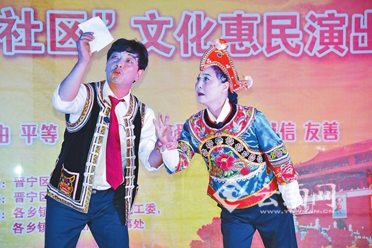 近日,“2017年晋宁区文化惠民演出”走进乡村、社区。区文化馆组织了两支优秀演出队奔赴全区各镇、街道的村、社区演出14场,受到群众的欢迎。