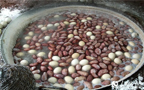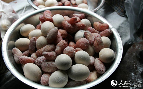 当地村民正在翻看用卤水煮的鸡蛋和土豆。人民网记者 虎遵会 摄