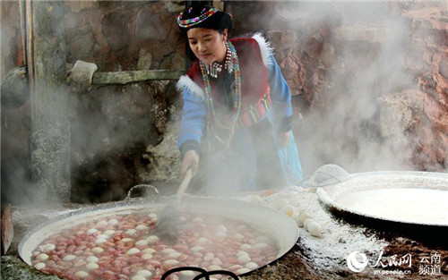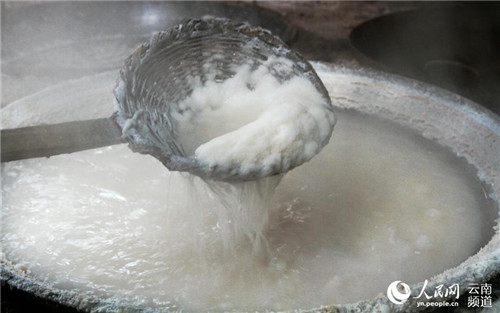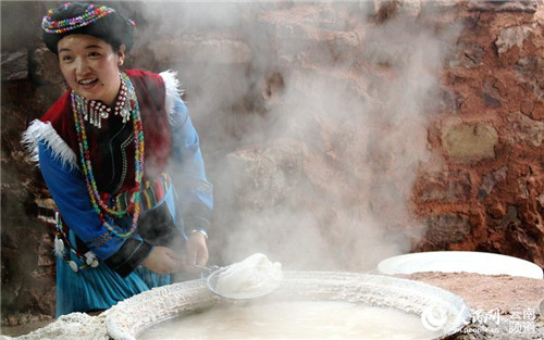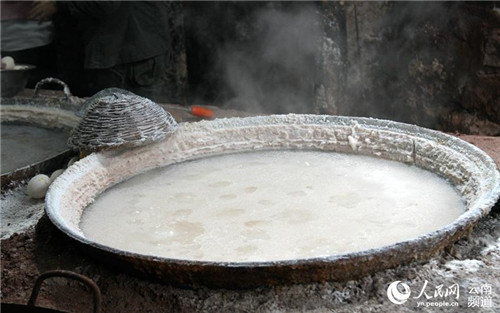 当地村民正在煎制桃花盐。人民网记者 虎遵会 摄
