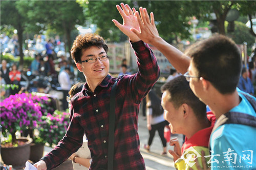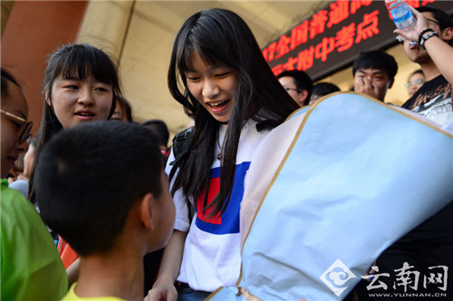 云大附中考场门口,一位小弟弟抱着鲜花在等高考结束的姐姐,姐姐一走出考场,他就赶忙把花送给姐姐。
