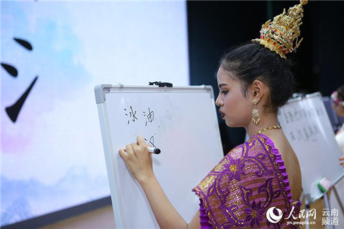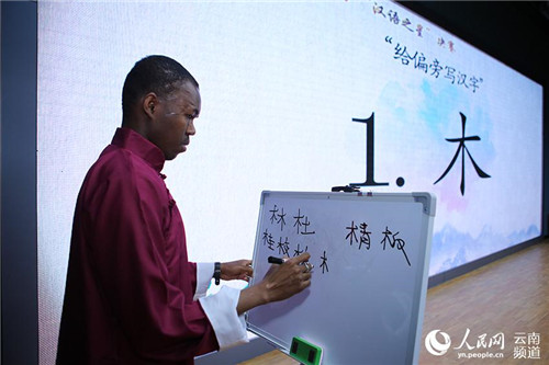 参加决赛的留学生在“给偏旁写汉字”比赛环节中。