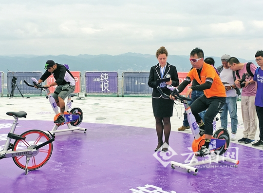 近日,在海拔约2199米、垂直高度300米的万达·昆明双塔停机坪上,近百名爱心骑手们通过不间断的骑行接力,在6小时中共骑行462.47公里,成功挑战世界纪录。当天所有骑行里程数将兑换为由可口可乐出品的冰露纯悦饮用水,并在赛后捐赠至爱心小学。