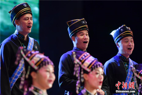 《坡芽歌书》演出团成员正在进行表演。《中国富宁壮族坡芽歌书》演出团在2016年曾获得第九届世界合唱比赛冠军组无伴奏民谣组别金奖。 中新社记者 任东 摄