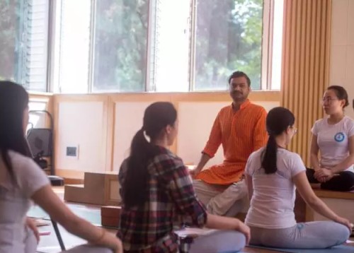 “双手合十放于胸前,手掌放在双膝,保持脊柱的中正……”37岁的印度瑜伽老师素芭认真地向面前的十余名学生说道。