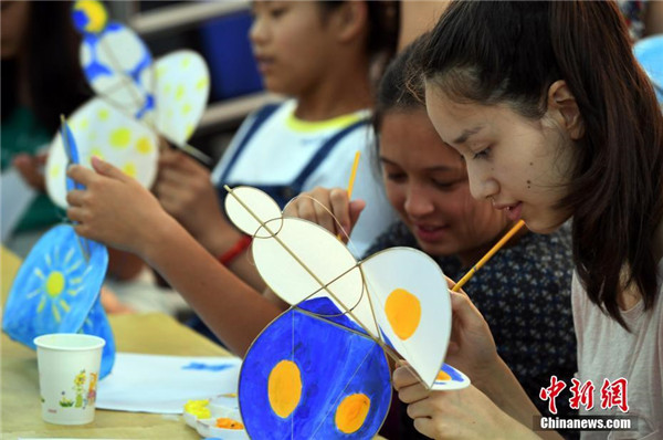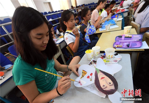 7月26日,学生们在滇派硬翅风筝上绘制自己喜欢的图案。中新社记者 李进红 摄
