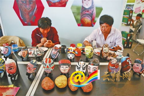 连日来,在昆明精品馆寻甸县展台前,几位农民画家创作的“彩绘土豆”成为亮点。