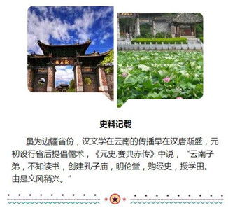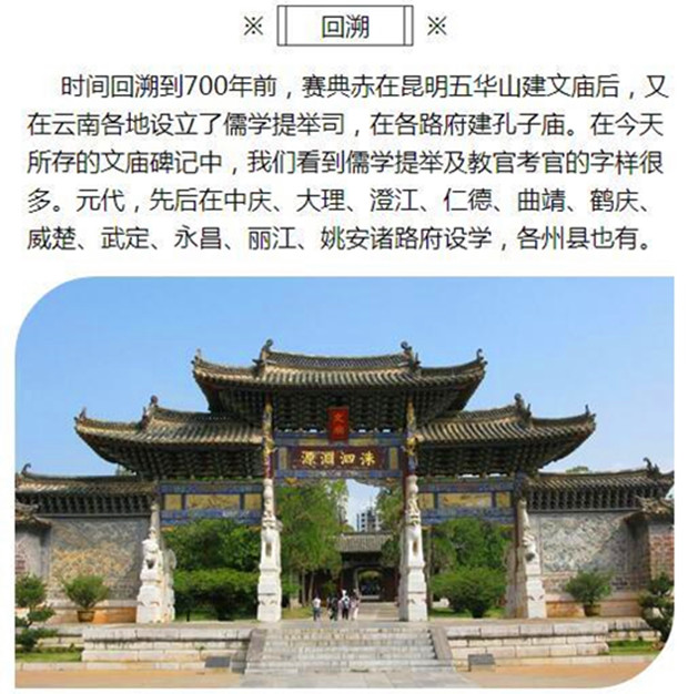 自此,建庙置官,倡导儒学之风渐盛。张立道是元初总管,在《元史.张立道传》中就提到:“先是云南未知尊孔子祀王逸少为先师。立道首建孔子庙,置学舍,土人子弟以学。择蜀士之贤者,迎以为子弟师”。