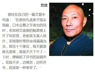 “说书人语调抑扬顿挫,表情眉飞色舞。绘声绘色的情节叙述,惟妙惟肖的人物对话,声音洪亮得使整个茶馆有 瓮瓮 声,惊堂木则拍得 啪啪 作响。再看那些听书人,有的手拄腮墩儿,听得津津有味;有的人半张着嘴,被评书中的故事打动得不能自已;还有的人更是到了入迷上瘾的程度,随着故事情节的发展,他一会儿长吁短叹,潸然泪下,一会儿又喝声叫 好 !猛拍巴掌。说他如痴如醉,忘乎所以,一点也不夸张。”詹霖在书中描述了老辈子人跟他讲的文庙最让人记忆犹新的故事。