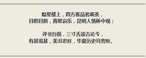 听书正听到精彩处,当那说书人把惊堂木猛地一敲,“啪”的一声,接着来了一句:“要知后事如何?且听下回分解!”于是,全场一片嘘声,有的埋怨说书人太卖关子,有点故弄玄虚;有的则恨时间过得太快,听书不能尽兴。反正说客天天台上讲,听者天天来喝茶,评书一天没有断,故事一直讲下去。老昆明人记住了评书中的精彩片段,记住了有名的说书人:陈玉鑫、雷震北、杨志远和刘俊杰,当然他们还记住了当年的一副对联: