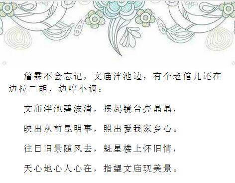詹霖说,民国时,对大多数老昆明人来说,要直接从书本里了解古典文学中的精彩内容,是很不容易的,听评书便是直接而痛快的事了。《封神榜》、《水浒传》、《三国演义》和《说唐》,各种评书轮番着说。而去了解这些古典文学魅力之所在的地方就是昆明的文庙内的空阔之地。