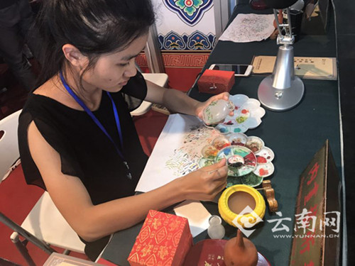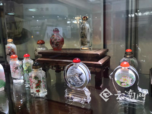 在昆明精品馆官渡区展台内,一排排绘画精细、色彩丰富的鼻烟壶整齐划一地摆放着,鼻烟壶的瓶身有玻璃、水晶、琥珀等材质,晶莹透亮,瓶身内部分别画上山茶花、孔雀等图案。这些内画鼻烟壶作品都由中国内画艺术大师、滇派内画艺术传习馆馆长孙鸿雁和她的弟子们创作。