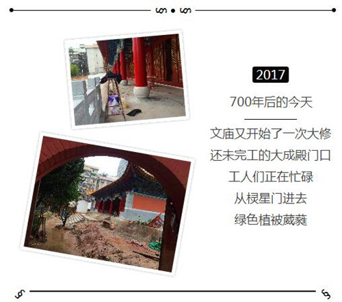 700年后的今天,文庙又开始了一次大修。在还未完工的文庙大成殿门口,工人们正在忙碌,从棂星门进去,绿色植被葳蕤。