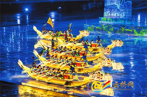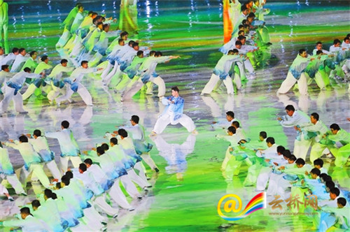 惊涛拍岸,当海河水向两侧排开,600名身着红黑相间练功服的少年奔跑而上,霍家拳虎虎生风。天津是著名爱国武术家霍元甲的故乡,据该节目中10岁的小演员刘俊豪介绍,他们全部来自霍元甲文武学校,“我希望把身体锻炼好,将来建设祖国”。