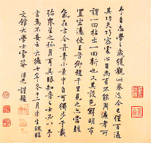蔡京在这幅作品上留下一段题跋,记述了宋徽宗指点王希孟,收他入翰林书画院的经历:“政和三年闰四月八日赐。希孟年十八岁,昔在画学为生徒,召入禁中文书库,数以画献,未甚工。上知其性可教,遂诲谕之,亲授其法,不逾半岁,乃以此图进。上嘉之,因以赐臣京,谓天下士在作之而已。”此外再没有关于王希孟的记述,不久便英年早逝。