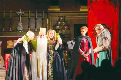 我创意策划的“汤莎会”,由中英两国艺术家共同参与、通力合作。中英版《邯郸梦》拥有一支至今仍令我引以为豪的国际化阵容。在进入排练前,我与英国团队通过网络已进行了大半年的交流,基本敲定了剧本。随着排练的深入,剧本随时都在修改,我们对拼贴与融合的态度小心翼翼,以求达到自然巧妙,比如第一折,卢生入梦时,《麦克白》的女巫上场,英文歌唱:“斑猫已经叫过三声,刺猬已经啼了四次,怪鸟在鸣啸:时候到了,时候到了……”预告着卢生的梦中荣华终会成空;第二折中,卢生成为大将军征战边关,《亨利五世》中的战争场面适时切入。排练时,双方不厌其烦地叫停、询问、探讨、调整。有趣的是,我与英方导演里昂虽然语言不通,却常常无需翻译,通过手势、表情就达成了对某个细节的一致意见,里昂说他与我“心心相印”。