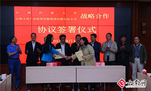 9月11日,云南民族大学与云南文投集团在昆明签署战略合作协议。双方将在合作办学、产教融合构建实习实训基地、文化品牌打造和文化产品营销等方面展开深入合作。