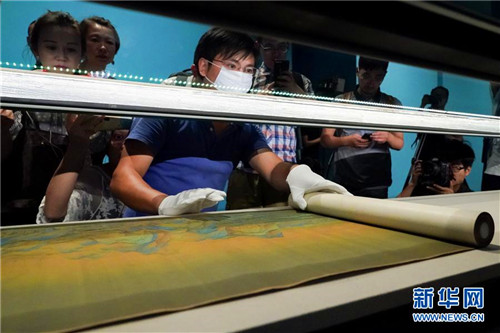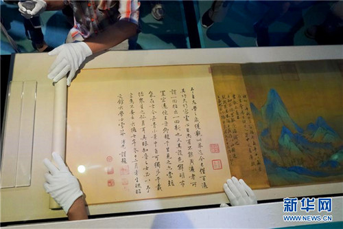 9月11日,故宫博物院的工作人员将《千里江山图》布置到展柜中。