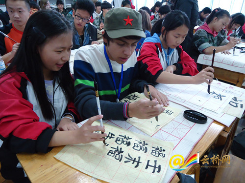 外国学生在中国中学课堂学习书法。云桥网 陈灿霞 摄